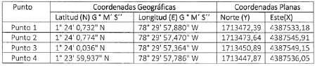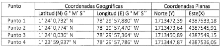 En atención a lo anterior, la Dirección Territorial Nariño de la Unidad de Restitución de Tierras, se propuso microfocalizar el área correspondiente a trescientos doce metros cuadrados (312 m2), ubicado en la vereda Vaquerio, corregimiento de Llorente del municipio de Tumaco, del departamento de Nariño conforme al plano del Informe de Microfocalización elaborado por el Área Catastral de esta Dirección Territorial, que forma parte integral del presente acto administrativo y que cuenta con las siguientes coordenadas geográficas en grados, minutos y segundos (Magna-Sirgas11), puntos extremos del área seleccionada, así: