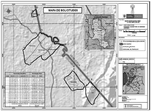 Como referencia para la elaboración de la zona microfocalizada de un sector del municipio de Tibú conformado por las veredas Tres Bocas parte norte, Punta de Palo, Kilómetro 12 Los Lirios, El Encanto La Guajira, Puerto Reyes y El 88, se toma como fuente principal la información oficial cartográfica del Instituto Geográfico Agustín Codazzi - IGAC, límite municipal de las ordenanzas y con la información vigente acorde Memorando 3080 de 2020 de la Subdirectora de Geografía y Cartografía, suministrando la información tales como límites nacional, departamental y municipal, de la misma manera se verifico la existencia de zonas en litigio o conflicto mediante límite de conflictos “Conflicto Limítrofe Mpal Deptal 2017 k100” Como segunda fuente de información oficial se tomó como referencia los Plan Básico De Ordenamiento Territorial del municipio de Tibú (Acuerdo número 028 de 06/12/2000). Adicionalmente se apoyó con la información oficial del catastro rural del INSTITUTO GEOGRÁFICO AGUSTÍN CODAZZI -IGAC de los municipios Tibú, con vigencia de 2015. Así mismo se apoyó con los polígonos de las zonas microexistentes de otros municipios para no generar casos topológicos.