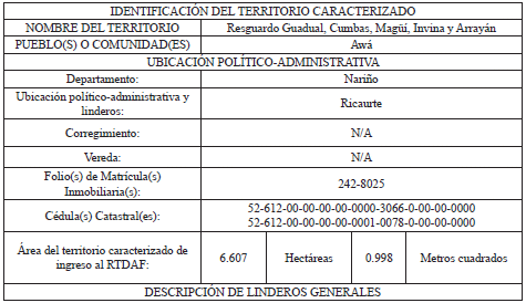 Que, toda vez que el informe de caracterización identificó afectaciones territoriales, el mismo recomienda la inscripción del territorio colectivo del Resguardo Guadual, Cumbas, Magüí, Invina y Arrayán del pueblo indígena Awá, ubicado en jurisdicción del municipio de Ricaurte, departamento de Nariño, en el Registro de Tierras Despojadas y Abandonadas Forzosamente.