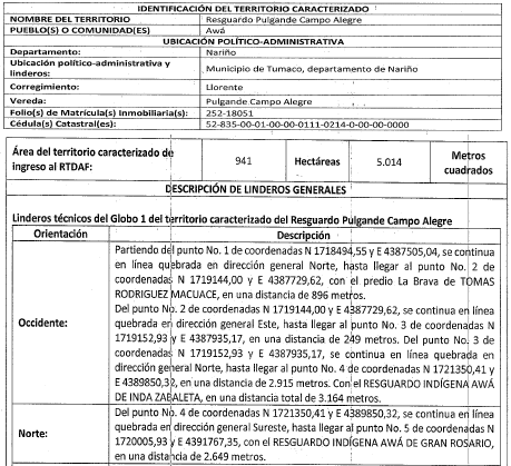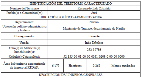 Que el informe de caracterización de afectaciones territoriales del territorio colectivo de los Resguardos Inda Zabaleta, Inda Guacaray y Pulgande Campo Alegre pertenecientes al pueblo indígena Awá, ubicados en el municipio de Tumaco, departamento de Nariño, fue avalado por las autoridades y comunidad indígena del Resguardo el 27 de noviembre de 2020, como consta en el acta respectiva, y adoptado por la UAEGRTD, a través de la Dirección Territorial Nariño, mediante la Resolución No RZE-1876 del 2 de diciembre de 20207.
