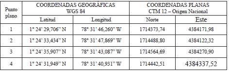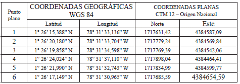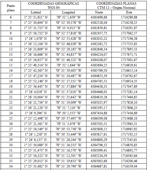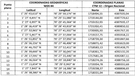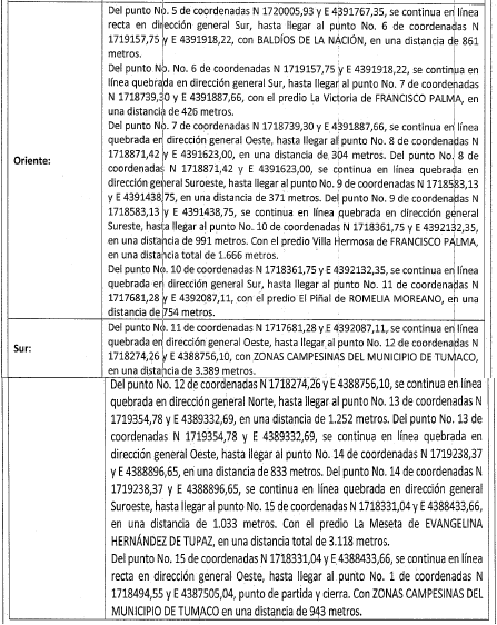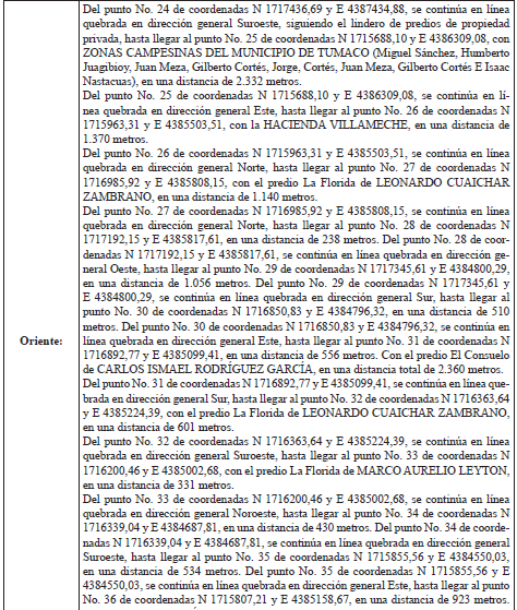 | Del punto No. 14 de coordenadas N 1718903,96 y E 4386242,44, se continúa en línea quebrada en dirección general Oeste, hasta encontrar el punto No. 15 de coordenadas N 1718833,95 y E 4385750,91, en una distancia de 525 metros. Del punto No. 15 de coordenadas N 1718833,95 y E 4385750,91, se continúa en línea quebrada en dirección general Sur, hasta encontrar el punto No. 16 de coordenadas N 1718596,47 y E 4385620,83, en una distancia de 317 metros. Del punto No. 16 de coordenadas N 1718596,47 y E 4385620,83, se continúa en línea recta en dirección Este, hasta encontrar el punto No. 17 de coordenadas N 1718549,82 y E 4385825,01, en una distancia de 209 metros. Con el predio El Platanal de JESÚS MARÍA RODRÍGUEZ, en una distancia total de 1.051 metros. Del punto No. 17 de coordenadas N 1718549,82 y E 4385825,01, se continúa en línea quebrada en dirección general Sur, hasta encontrar el punto No. 18 de coordenadas N 1718508,08 y E 4385808,83, con el predio El Progreso de FLORIBERTO SOLARTE, en una distancia de 45 metros. Del punto No. 18 de coordenadas N 1718508,08 y E 4385808,83, se continúa en línea quebrada en dirección general Oeste, hasta encontrar el punto No. 19 de coordenadas N 1718491,54 y E 4385486,27, con el predio El Limón de SEGUNDO MARÍN, en una distancia de 424 metros. Del punto No. 19 de coordenadas N 1718491,54 y E 4385486,27, se continúa en línea quebrada en dirección general Noroeste, hasta encontrar el punto No. 20 de coordenadas N 1718548,99 y E 4385394,38, con el predio Villavicencio de JULIO GUANGA, en una distancia de 113 metros. Del punto No. 20 de coordenadas N 1718548,99 y E 4385394,38, se continúa en línea quebrada en dirección general Noroeste, hasta encontrar el punto No. 21 de coordenadas N 1719339,15 y E 4384956,82, con el predio El Consuelo de HERMENCIA ROJAS DE VEGA, en una distancia de 1.099 metros. Del punto No. 21 de coordenadas N 1719339,15 y E 4384956,82, se continúa en línea quebrada en dirección general Noreste, hasta encontrar el punto No. 22 de coordenadas N 1719585,83 y E 4385098,65, con el predio Victoria de LUIS QUELAL, en una distancia de 300 metros. Del punto No. 22 de coordenadas N 1719585,83 y E 4385098,65, se continúa en línea quebrada en dirección general Noreste, hasta encontrar el punto No. 23 de coordenadas N 1719775,03 y E 4385410,09, en una distancia de 458 metros. Del punto No. 23 de coordenadas N 1719775,03 y E 4385410,09, se continúa en línea quebrada en dirección general Noroeste, hasta encontrar el punto No. 24 de coordenadas N 1720275,09 y E 4384716,88, en una distancia de 987 metros. Del punto No. 24 de coordenadas N 1720275,09 y E 4384716,88, se continúa en línea quebrada en dirección general Suroeste, hasta encontrar el punto No. 25 de coordenadas N 1719855,36 y E 4384514,51, en una distancia de 470 metros. Con el predio El Consuelo de ALFONSO GUANGA, en una distancia total de 1.915 metros. Del punto No. 25 de coordenadas N 1719855,36 y E 4384514,51, se continúa en línea recta en dirección Sur, hasta encontrar el punto No. 26 de coordenadas N 1719695,23 y E 4384460,99, nuevamente con el predio Victoria de LUIS QUELAL, en una distancia de 169 metros. Del punto No. 26 de coordenadas N 1719695,23 y E 4384460,99, se continúa en línea recta en dirección general Oeste, hasta encontrar el punto No. 27 de coordenadas N 1719745,19 y E 4384264,95, en una distancia de 202 metros. Del punto No. 27 de coordenadas N 1719745,19 y E 4384264,95, se continúa en línea recta en dirección general Sur, hasta encontrar el punto No. 28 de coordenadas N 1719655,11 y E 4384201,31, en una distancia de 110 metros. Del punto No. 28 de coordenadas N 1719655,11 y E 4384201,31, se continúa en línea recta en dirección general Este, hasta encontrar el punto No. 29 de coordenadas N 1719526,42 y E 4384447,30, en una distancia de 276 metros. Con el predio Gaviota de ALFONSO PAI, en una distancia total de 588 metros. Del punto No. 29 de coordenadas N 1719526,42 y E 4384447,30, se continúa en línea quebrada en dirección general Sur, hasta encontrar el punto No. 30 de coordenadas N 1718781,00 y E 4384481,07, con la Vía Nacional y Caserío en una distancia de 919 metros. Del punto No. 30 de coordenadas N 1718781,00 y E 4384481,07, se continúa en línea quebrada en dirección general Oeste, hasta encontrar el punto No. 31 de coordenadas N 1718959,49 y E 4383520,71, con el predio San Luis de EUNICE ARÉVALO, en una distancia de 1.015 metros. Del punto No. 31 de coordenadas N 1718959,49 y E 4383520,71, se continúa en línea quebrada en dirección general Norte, hasta encontrar el punto No. 32 de coordenadas N 1719285,42 y E 4383648,77, en una distancia de 408 metros. Del punto No. 32 de coordenadas N 1719285,42 y E 4383648,77, se continúa en línea quebrada en dirección general Oeste, hasta encontrar el punto No. 33 de coordenadas N 1719586,15 y E 4383035,33, en una distancia de 692 metros. Con el predio La Pintada de ENRIQUE GUANGA, en una distancia total de 1.100 metros. Del punto No. 33 de coordenadas N 1719586,15 y E 4383035,33, se continúa en línea quebrada en dirección general Noreste, hasta encontrar el punto No. 34 de coordenadas N 1719954,21 y E 4383517,23, en una distancia de 770 metros. Del punto No. 34 de coordenadas N 1719954,21 y E 4383517,23, se continúa en línea quebrada en dirección general Noroeste, hasta encontrar el punto No. 35 de coordenadas N 1720294,73 y E 4382829,37, en una distancia de 987 metros. Del punto No. 35 de coordenadas N 1720294,73 y E 4382829,37, se continúa en línea quebrada en dirección general Sur, hasta encontrar el punto No. 36 de coordenadas N 1719741,77 y E 4382594,63, en una distancia de 615 metros. Con el predio San Isidro de LUIS PAI BENÍTEZ, en una distancia total de 2.372 metros. Del punto No. 36 de coordenadas N 1719741,77 y E 4382594,63, se continúa en línea quebrada en dirección general Sur, hasta encontrar el punto No. 37 de coordenadas N 1719167,