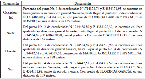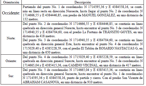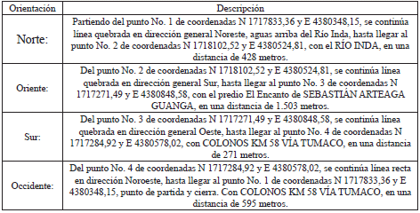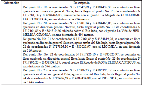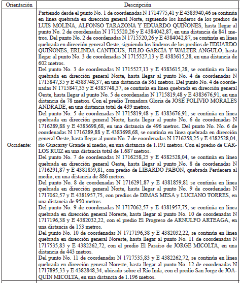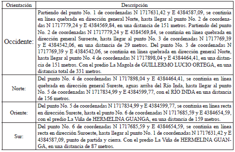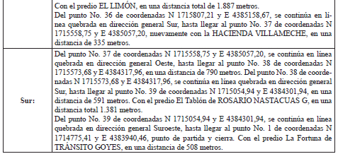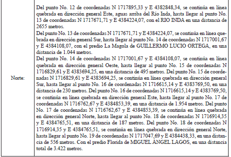 | Del punto No. 37 de coordenadas N 1719167,38 y E 4382389,44, se continúa en línea quebrada en dirección general Oeste, hasta encontrar el punto No. 38 de coordenadas N 1719301,09 y E 4381950,24, en una distancia de 491 metros. Del punto No. 38 de coordenadas N 1719301,09 y E 4381950,24, se continúa en línea quebrada en dirección general Sur, hasta encontrar el punto No. 39 de coordenadas N 1718368,83 y E 4381721,93, en una distancia de 987 metros. Del punto No. 39 de coordenadas N 1718368,83 y E 4381721,93, se continúa en línea quebrada en dirección general Este, hasta encontrar el punto No. 40 de coordenadas N 1718686,17 y E 4382438,87, en una distancia de 1.053 metros. Con el predio Santa Rosa de LUZ ANGÉLICA TAICUS, en una distancia total de 2.531 metros. Del punto No. 40 de coordenadas N 1718686,17 y E 4382438,87, se continúa en línea quebrada en dirección general Este, hasta encontrar el punto No. 41 de coordenadas N 1718527,58 y E 4382546,11, con el predio La Maravilla de NURY PATRICIA NAVARRO, en una distancia de 249 metros. Del punto No. 41 de coordenadas N 1718527,58 y E 4382546,11, se continúa en línea quebrada en dirección general Sureste, hasta encontrar el punto No. 42 de coordenadas N 1718404,69 y E 4382749,80, con el predio El Recuerdo de HERNANDO JEREMÍAS ARÉVALO, en una distancia de 241 metros. Del punto No. 42 de coordenadas N 1718404,69 y E 4382749,80, se continúa en línea recta en dirección Sureste, hasta encontrar el punto No. 43 de coordenadas N 1718391,35 y E 4382783,57, con el predio El Cenegal de HERNANDO JEREMÍAS ARÉVALO, en una distancia de 36 metros. Del punto No. 43 de coordenadas N 1718391,35 y E 4382783,57, se continúa en línea quebrada en dirección general Suroeste, hasta encontrar el punto No. 44 de coordenadas N 1718191,72 y E 4382704,05, con el predio La Esmeralda de RAIMUNDO RUALES, en una distancia de 215 metros. Del punto No. 44 de coordenadas N 1718191,72 y E 4382704,05, se continúa en línea quebrada en dirección general Oeste, aguas abajo del Río Inda, hasta encontrar el punto No. 1 de coordenadas N 1718330,83 y E 4381165,50, punto de partida y cierra. Con el RÍO INDA en una distancia de 2.308 metros. | |