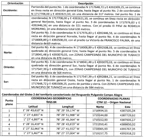 Linderos técnicos del Globo 2 del territorio caracterizado del Resguardo Pulgrande Campo Alegre: