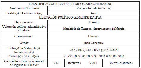 Resguardo Inda Guacaray: FMI 252-24070, 252-24092 y 252-22628 y código/ cédula catastral 52-835- 00-01-00-00-0035-0052-0-00-00-0000 se ubica en los siguientes límites: