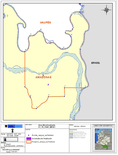 | 3 | 1° 22' 19,785” S | 69° 24' 39,543” W | 339533,51 | 1519905,41 |