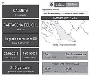 No obstante, frente a las operaciones de desminado humanitario indicó que Cartagena del Chairá, Caquetá, se priorizó para operaciones de desminado humanitario el 27 de junio de 2018, y posteriormente se asignó a la Organización Civil Ayuda Popular Noruega (APN), la cual debido a la fluctuación de las condiciones de seguridad, suspendió la intervención humanitaria. Ahora bien, pese a que a la fecha, las condiciones han vuelto a dar viabilidad para esta intervención, el inconveniente es que la Organización Civil APN, no se encuentra avalada para realizar actividades en Colombia; encontrándose actualmente el municipio disponible para que un operador de desminado humanitario presente una solicitud de asignación y volver a iniciar la implementación de plan de intervención con desminado humanitario. El reporte compartido del estado actual el es siguiente: