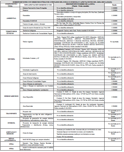 1.5 Sobre posiciones con Derechos Públicos o Privados del Suelo o Subsuelo y Afectaciones del Área Reclamada