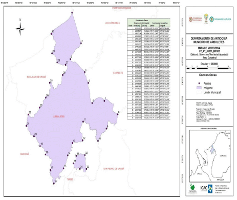 Que en atención al índice de despojo evidenciado en las solicitudes de inscripción en el RTDAF, respecto de predios ubicados en la zona municipio de Arboletes o atendiendo que la Unidad de Restitución ha realizado la intervención de las áreas que cuentan con mayor despojo y por lo tanto es indispensable atender las demás solicitudes de inscripción en el RTDAF con el fin de culminar la intervención de la Unidad de Restitución en las mismas, la Dirección Territorial Apartadó de la Unidad de Restitución de Tierras, se propuso microfocalizar los Corregimientos, Cabecera, El Guadual, Las Platas, El Yeso, La Trinidad, El Carmelo, Buenos Aires, La Candelaria, las Veredas, Arboletes, El Teso, Nuevo Oriente, Bajo Grande, El Volcán, Pajillal, Bajos La Arenosa, El Volcancito, Pangola, Barrancuda, El Yeso, Paraíso, Boca Al Revés, Filo de Venus, Pelayo, Buenos Aires, Garrapata, Piedrecitas, Calabozo, Holanda, Plan Parejo, Campanito, Holandita, Platas Del Medio, Canime, La Candelaria, Pueblo Chino, Cerro de Lajas, La Caridad, San Carlos, El Bonguito, La Mesita, San José, El Carmelo, La Toyosa, San Juancito Vijao El Chucho, La Trinidad, San Rafael El Coco, Las Parcelas, Siete Hermanas, El Guadual, Las Patillas, Trementino, El Guadual Del M, Las Pavitas, El Guáimaro, Las Platas, El Inglesito, Los Cajones, El Socorro, Marsella, El Tambo, Nueva Florida, municipio de Arboletes, departamento de Antioquia conforme lo representado en el mapa N° 1.6.1 Plano Zona Propuesta a Microfocalizar, elaborado por esta Dirección Territorial, que forma parte integral del presente acto administrativo y que cuenta con las siguientes coordenadas geográficas en grados, minutos y segundos (MAGNA-SIRGAS1 ) puntos extremos del área seleccionada, así:
