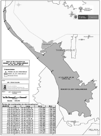 Que atendiendo que la Unidad de Restitución ha realizado la intervención de las áreas que cuentan con mayor despojo y por lo tanto es indispensable atender las demás solicitudes de inscripción en el RTDAF con el fin de culminar la intervención de la Unidad de Restitución en las mismas, la Dirección Territorial Cesar Guajira de la Unidad de Restitución de Tierras, se propuso microfocalizar las veredas Bocachica, Las Palmas, Mata de Agua, El Totumo del municipio de Tamalameque, departamento del Cesar, conforme lo representado en el mapa N° UT_CG_20787_MF_03, elaborado por esta Dirección Territorial, que forma parte integral del presente acto administrativo y que cuenta con las siguientes coordenadas geográficas en grados, minutos y segundos (MAGNA-SIRGAS1 puntos extremos del área seleccionada, así: