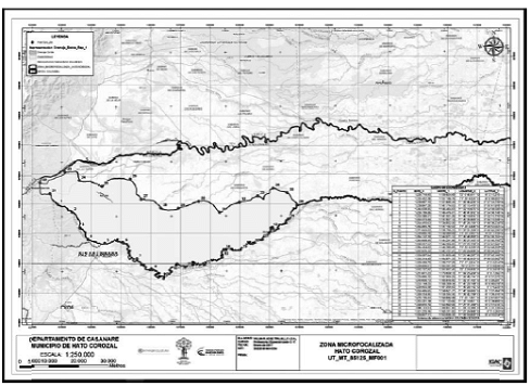 PRIMERO. Microfocalizar la zona sur oriental del municipio de Hato Corozal, en el departamento del Casanare, señalado en el Plano Predial número UT_ MT_85125_MF001, elaborado por esta Dirección Territorial, y que cuenta con las coordenadas geográficas en grados, minutos y segundos (MAGNA-SIRGAS(2)) puntos extremos del área seleccionada, relacionados en la parte motiva del acto administrativo.