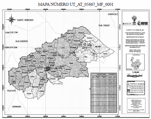 Que la Dirección Territorial Antioquia de la UAEGRTD, se propuso microfocalizar una parte del municipio de San Rafael del departamento de Antioquia, específicamente las veredas identificadas catastralmente como Balsas, Boquerón, Chico, Cirpes, Cuervos, Dantas, Danticas, El Bizcocho, El Brasil, El Cardal, El Charco, El Diamante, El Golgota, El Ingenio, El Jague, El Silencio, Farallones, Guadual, Guadualito, Honda, La Clara, La Cumbre, La Estrella, La Florida, La Granja, La Luz, La Pradera, Los Medios, Los Centros, Macanal, Manila, Media Cuesta, Peñoles, Piedras Abajo, Piedras Arriba, Playas, Puente Tierra, Samaria, San Agustín, San Miguel, Tesorito, Topacio, y Totumito, conforme lo representado en el Mapa número UT_AT_05667_MF_0001, elaborado por esta Dirección Territorial, que forma parte integral del presente acto administrativo y que cuenta con las siguientes coordenadas geográficas en grados, minutos y segundos (MAGNA-SIRGAS(1)) puntos extremos del área seleccionada, así: