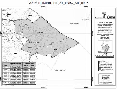 Que la Dirección Territorial Antioquia de la UAEGRTD, se propuso microfocalizar una parte del municipio de San Rafael en el departamento de Antioquia, específicamente las veredas identificadas catastralmente como Dorada, Las Divisas, San Julián y Santa Cruz, conforme lo representado en el Mapa número UT_AT_05667_MF_0002, elaborado por esta Dirección Territorial, que forma parte integral del presente acto administrativo y que cuenta con las siguientes coordenadas geográficas en grados, minutos y segundos (MAGNA-SIRGAS(1)) puntos extremos del área seleccionada, así: