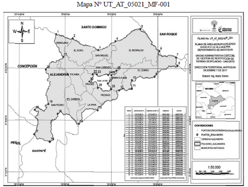 Que la Dirección Territorial Antioquia de la UAEGRTD, se propuso microfocalizar una parte del municipio de Alejandría en el departamento de Antioquia, específicamente las veredas identificadas catastralmente como El Carbón, San Lorenzo, San Miguel, Cruces, La Inmaculada, El Respaldo, La Pava, Piedras, Remolino, El Popo, San Pedro, Tocaima y El Cerro, conforme lo representado en el Mapa número UT_AT_05021_ MF-001, elaborado por esta Dirección Territorial, que forma parte integral del presente acto administrativo y que cuenta con las siguientes coordenadas geográficas en grados, minutos y segundos (MAGNA-SIRGAS(1)) puntos extremos del área seleccionada, así: