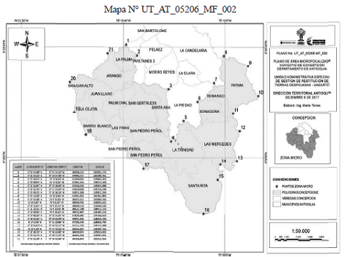 Que la Dirección Territorial Antioquia de la UAEGRTD, se propuso microfocalizar una parte del municipio de Concepción en el departamento de Antioquia, específicamente las veredas identificadas catastralmente como La Palma, Arango, San Juan Alto, Juan Llano, La Cejita, Palmichal, San Gertrudis, Barro Blanco, Las Frías, San Pedro Peñol, La Trinidad, Las Mercedes, Santa Rita, San Pedro Peñol, Sonadora Remango, Santa Ana y Fátima, conforme lo representado en el Mapa N° UT_AT_05206_MF_002, elaborado por esta Dirección Territorial, que forma parte integral del presente acto administrativo y que cuenta con las siguientes coordenadas geográficas en grados, minutos y segundos (MAGNA-SIRGAS(1)3) puntos extremos del área seleccionada, así: