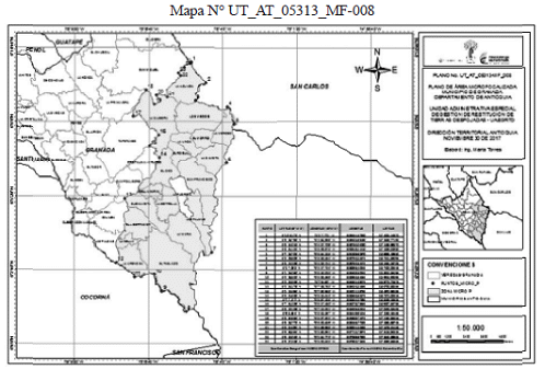 Que la Dirección Territorial Antioquia de la UAEGRTD, se propuso microfocalizar una parte del municipio de Granada en el departamento de Antioquia, en sus corregimientos Cabecera y Santa Ana específicamente las veredas identificadas catastralmente como La Aguada, La Quiebra, Los Medios, La Merced, El Morro, La Linda, El Roblal, La Gaviota, El Oso, San Francisco, Bella María, La Estrella, Buena Vista, El Libertador, La María, La Selva, La Arenosa, El Tablazo, conforme lo representado en el Mapa N° UT_AT_05313_ MF-008, elaborado por esta Dirección Territorial, que forma parte integral del presente acto administrativo y que cuenta con las siguientes coordenadas geográficas en grados, minutos y segundos (MAGNA-SIRGAS(1)) puntos extremos del área seleccionada, así:
