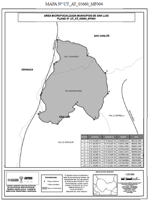Que la Dirección Territorial Antioquia de la UAEGRTD, se propuso microfocalizar una parte del municipio de San Luis en el departamento de Antioquia, específicamente las veredas Villanueva y Buenos Aires, conforme lo representado en el MAPA N° UT_ AT_05660_MF004, elaborado por esta Dirección Territorial, que forma parte integral del presente acto administrativo y que cuenta con las siguientes coordenadas geográficas en grados, minutos y segundos (MAGNA-SIRGAS4(1)) puntos extremos del área seleccionada, así: