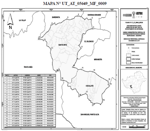 Que la Dirección Territorial Antioquia de la UAEGRTD, se propuso microfocalizar una parte del municipio de San Carlos en el departamento de Antioquia, específicamente las veredas identificadas catastralmente como Cocalito y Santa Rita, conforme lo representado en el Mapa N° UT_AT_05649_MF_0009, elaborado por esta Dirección Territorial, que forma parte integral del presente acto administrativo y que cuenta con las siguientes coordenadas geográficas en grados, minutos y segundos (MAGNA-SIRGAS7(1)) puntos extremos del área seleccionada, así: