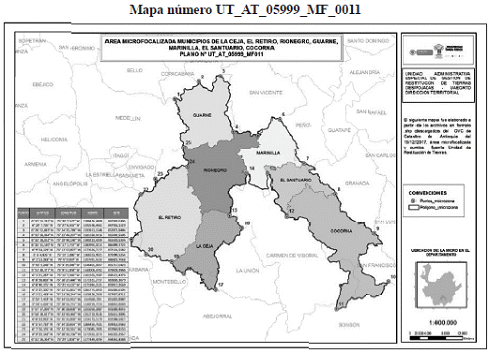 Que la Dirección Territorial Antioquia de la UAEGRTD, se propuso adelantar una intervención conjunta en los municipios de Cocorná, La Ceja, El Retiro, Rionegro, Guarne, Marinilla y El Santuario en el departamento de Antioquia, microfocalizando todas las veredas y los cascos urbanos de dichos municipios, conforme lo representado en el Mapa número UT_AT_05999_MF_0011, elaborado por esta Dirección Territorial, que forma parte integral del presente acto administrativo y que cuenta con las siguientes coordenadas geográficas en grados, minutos y segundos (MAGNA-SIRGAS(1)) puntos extremos del área seleccionada, así: