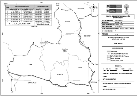 | 4 | 6° 11' 22,841” N | 75° 29' 57,885” W | 2242598,361 | 4723512,961 |