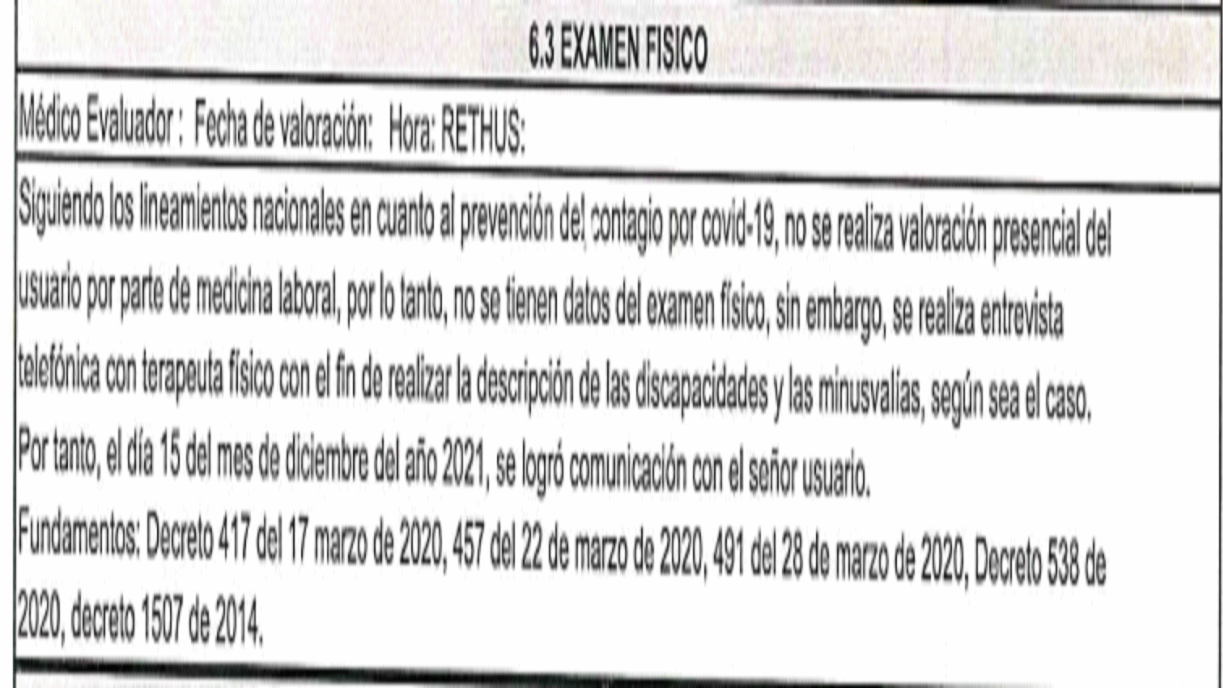 5.13 Ahora bien, la accionada explicó en sus distintas intervenciones que, en razón a la coyuntura Nacional que se estaba presentando en el año 2020 con ocasión del Covid–19 prescindió de la realización de un examen físico y, en consecuencia, emitió el dictamen del 20 de diciembre de 2021, que llevó a la suspensión de la pensión del tutelante, tomando en cuenta la documentación aportada por el afiliado en el curso del proceso de revisión de su estado de invalidez. Así mismo quedó consignado en la imagen que se extrajo del aludido dictamen, la cual se anexó previamente (ver Supra 5.5- numeral iv).